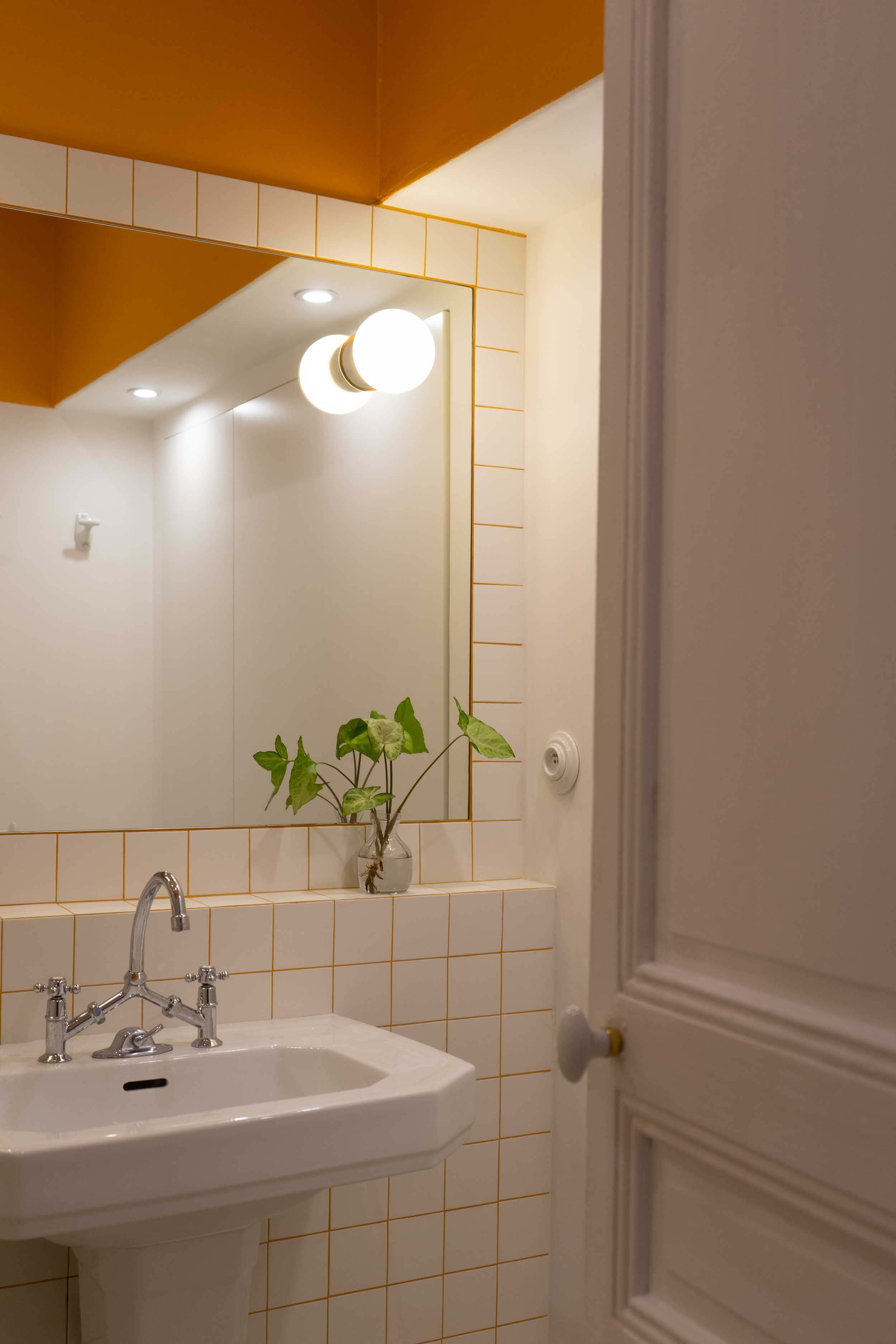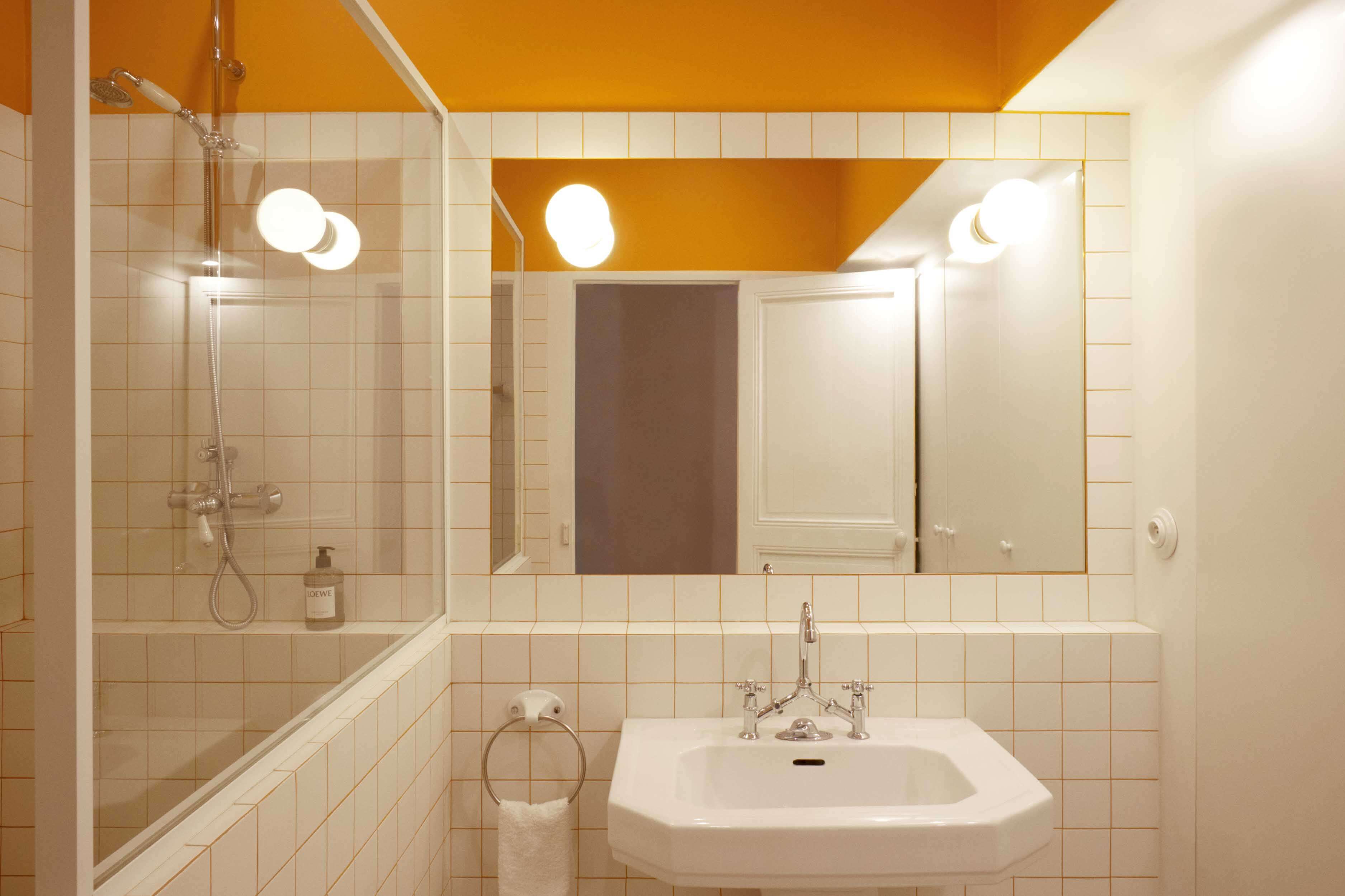 La partie nuit est pensée comme une suite d’hôtel. Dans le salle de bain, un jeu est fait entre, d’un coté, un orange très pop et assumé. Et d’un autre coté, une architecture et une sélection de matériaux à la fois classique et intemporel.