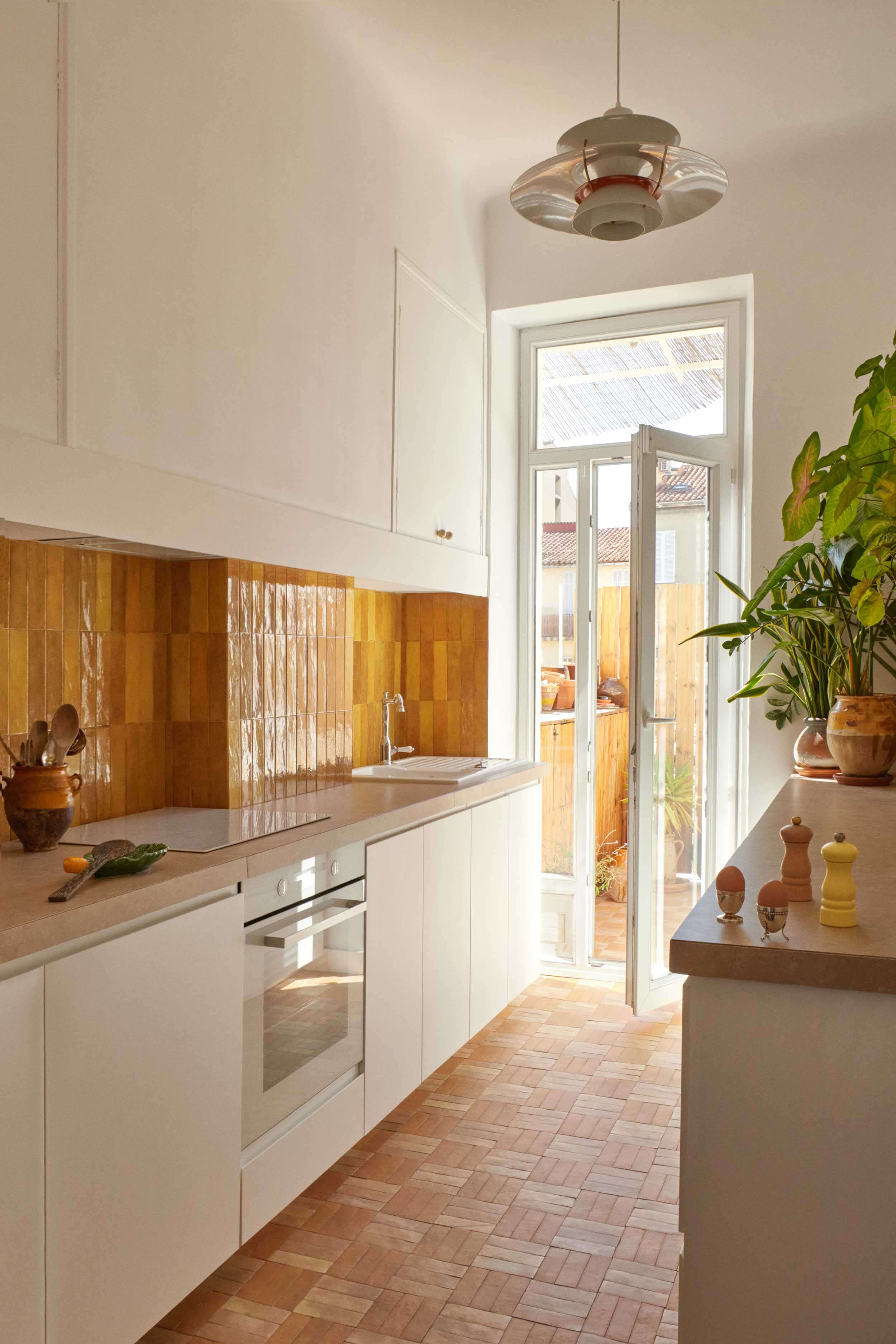 La cuisine a gardé ses formes d’origine avec ses placards en hauteur et cet esprit authentique. Ont été ajoutées à cela des touches de modernité et de clarté. Les portes blanches matt captent la luminosité tandis que la crédence jaune brillante augmentent la lumière. Le sol en bejmat offre à l’ensemble un coté graphique et impose une perspectives à la pièce, en insufflant par la même occasion un aspect méditerranéen.