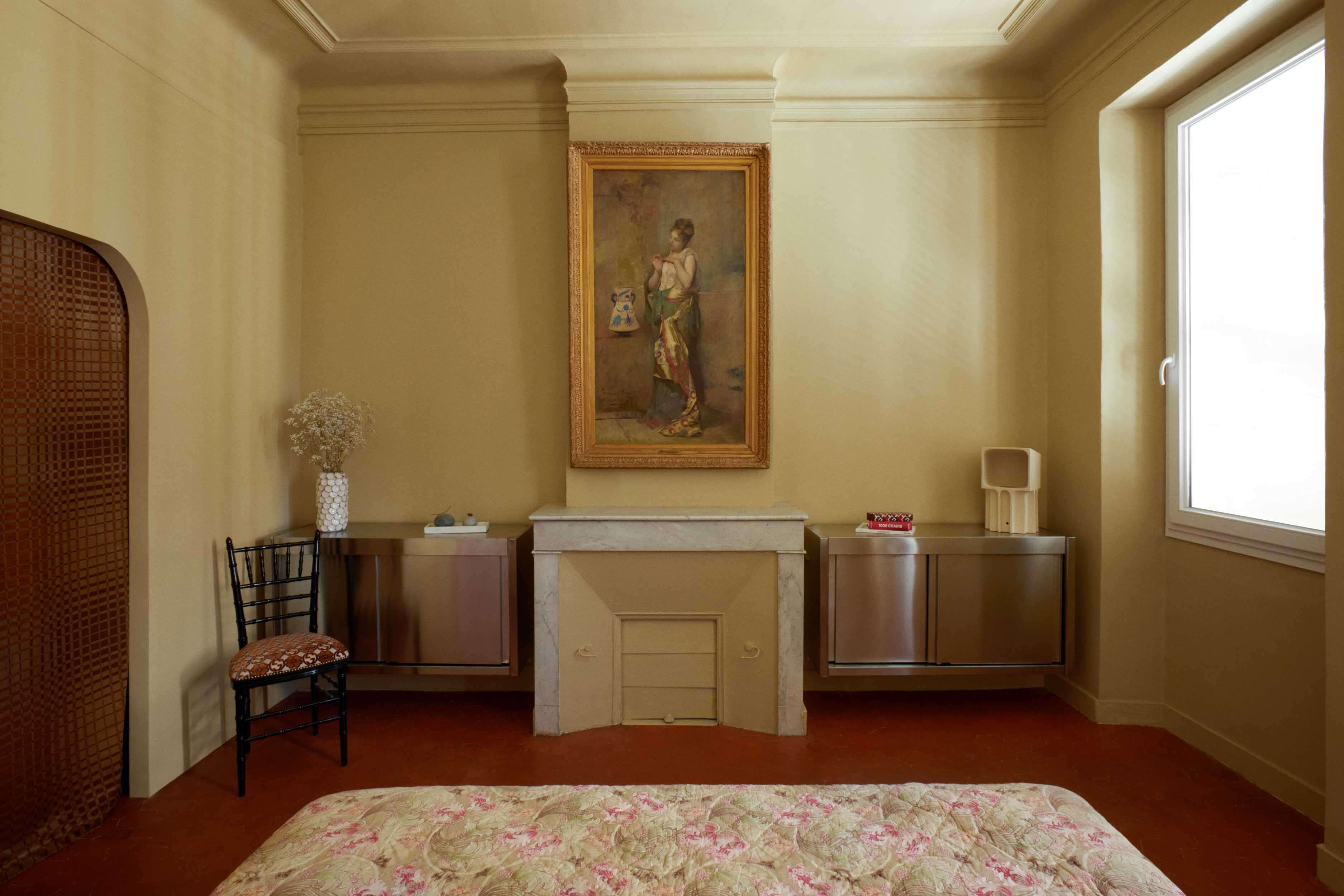 Dans la chambre, l’idée était de donner l’impression aux propriétaire d’être comme dans un palais vénitien. Les murs et l’agencement qui inclue la tête de lit, sont habillés d’une peinture très chaleureuse et indescriptible : ni jaune, ni beige, ni verte. Enfin, les tissus, les formes arrondies, les oeuvres d’art et les meubles en inox racontent une histoire romantique voir mélancolique.